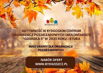 Od poniedziałku, 1 września br. w Bydgoskim Centrum Organizacji Pozarządowych i Wolontariatu „Gdańska 5” startuje nabór ofert w ramach tzw. małych grantów dla organizacji pozarządowych na realizację jesienno-zimowych wydarzeń dla mieszkańców Bydgoszczy. Zachęcamy przedstawicieli organizacji...