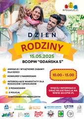 W dniu 15 maja obchodzić będziemy Międzynarodowy Dzień Rodzin, w związku z tym przestrzeń BCOPW, przy ul. Gdańskiej 5, wypełni się rodzinami z dziećmi. Podczas wydarzenia będziemy świętować ”Dzień z Rodziną”, tym razem pod hasłem „Dzień Rodziny: z sercem, z głową, z troską”.